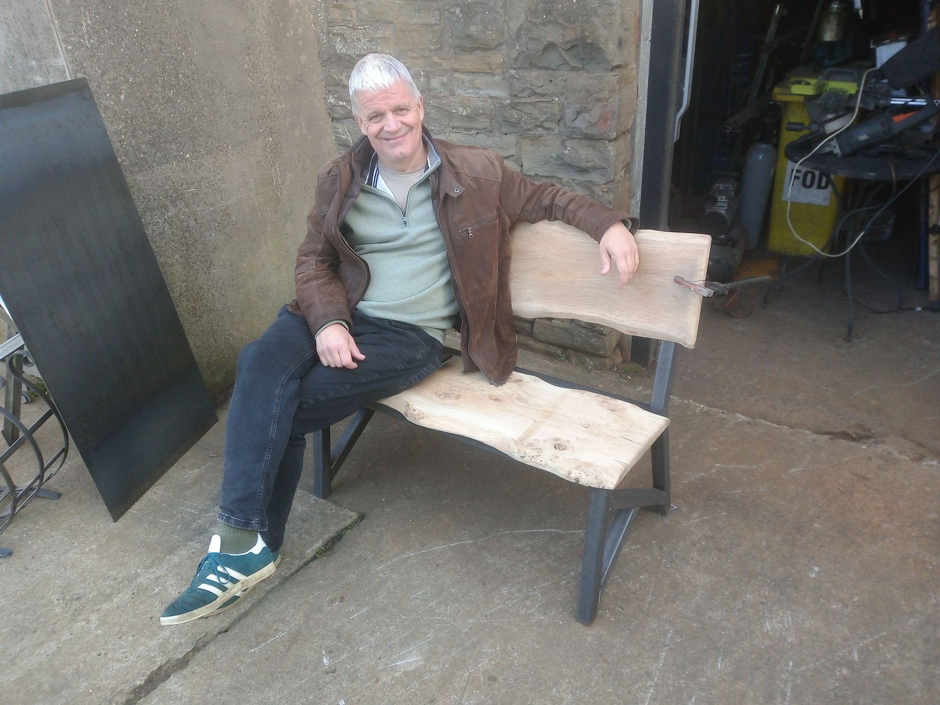 Local Bristol customers who spotted our garden bench at Portishead Summer Show last year put in a request for a retrofit to ensure the bench was adjusted accordingly and comfortable to sit on! Pictured here, you can see Nick visiting our Yatton workshop for a trial seating session, and the 10 degrees off right angle worked perfectly. Happy with the retrofit, John had the go-ahead to anti-corrosion zinc prime the steel of the bench before the powder coating could begin.